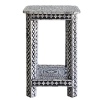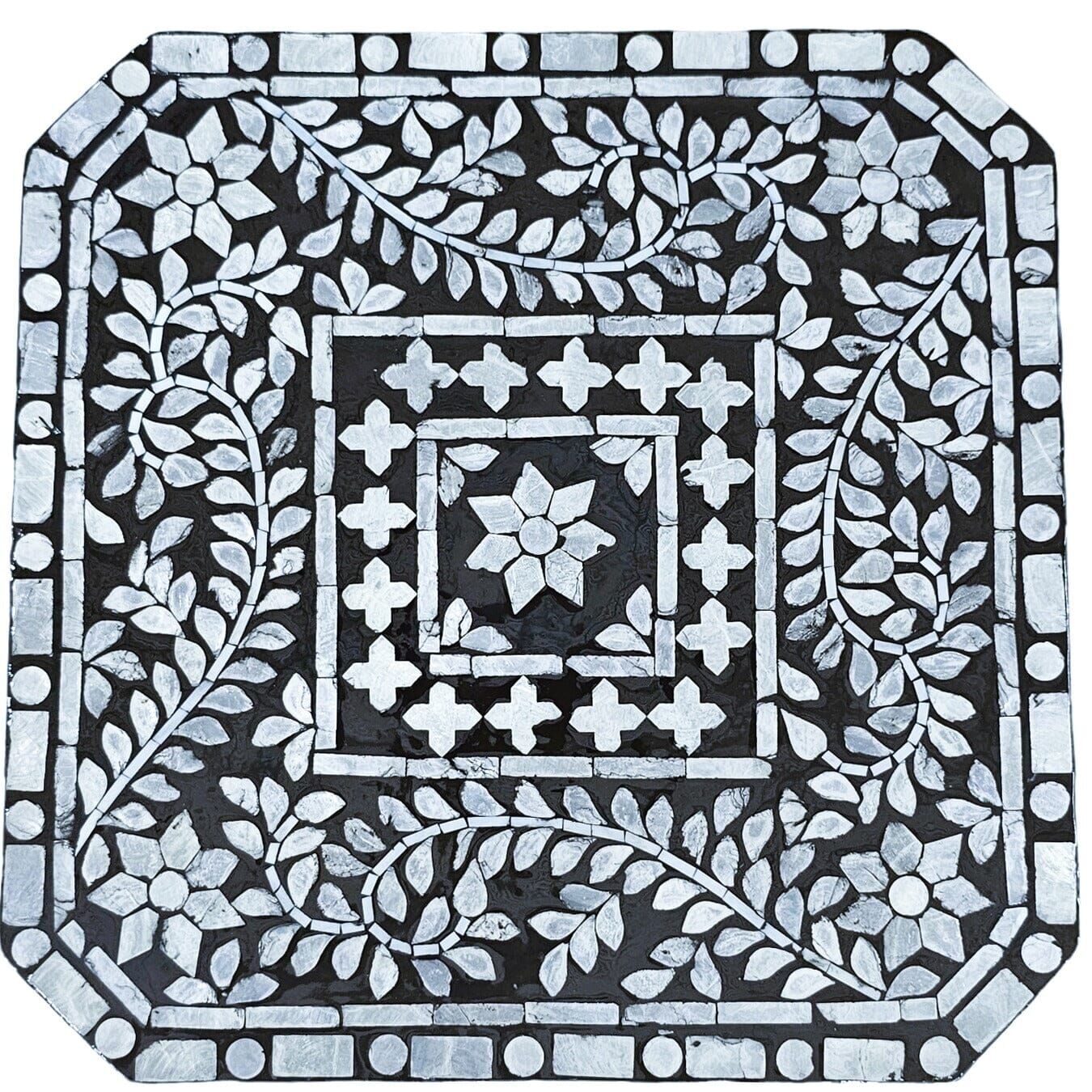 Introducing the Noir Opulence Mother of Pearl Side Table, a striking addition to our exclusive Mother of Pearl range. This side table features a captivating black and white mosaic finish, meticulously hand-laid by skilled artisans. The contrasting monochrome palette creates a bold and sophisticated look that adds a touch of opulence to your living space. The intricate mosaic pattern showcases the artistry and craftsmanship behind every piece, making each table a unique work of art. The sleek and compact design of the side table allows for versatile placement in various rooms and decor styles. Crafted with attention to detail and quality, the Noir Opulence Mother of Pearl Side Table is not only a visually stunning piece but also a functional and stylish addition to your interior decor. Elevate your space with the timeless elegance and luxurious allure of this exceptional side table.