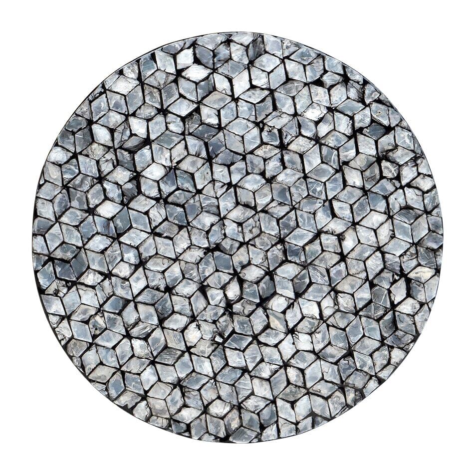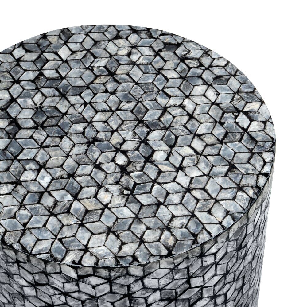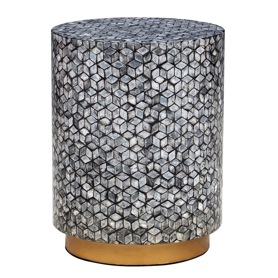 A round side table, stool or foot rest introducing our Blake circular shell stool. Adorned with silver, hexagonal-inspired discs of real sea shells that shimmer when they catch the light, this unique furniture piece will draw attention for all of the right reasons. Invest in a pair as bedside tables, use it as a stool for your desk, or as a stand-alone decor piece to rest a plant on, or coffee table books.