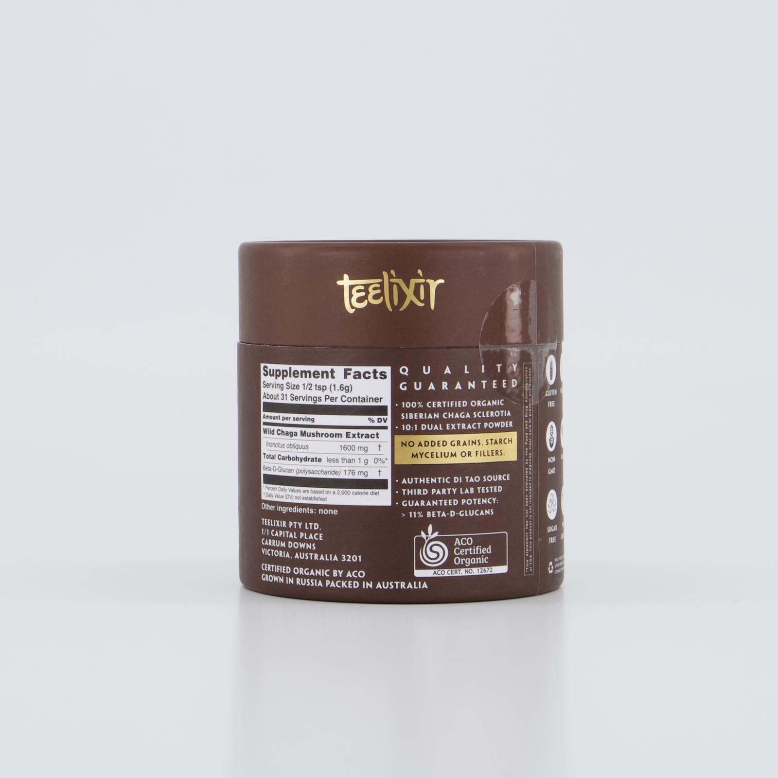 Quality and Tradition: Emphasizing purity and potency, Teelixir's Chaga extract is a product of rigorous commitment to quality, grounded in the intelligence of nature and supported by scientific research.