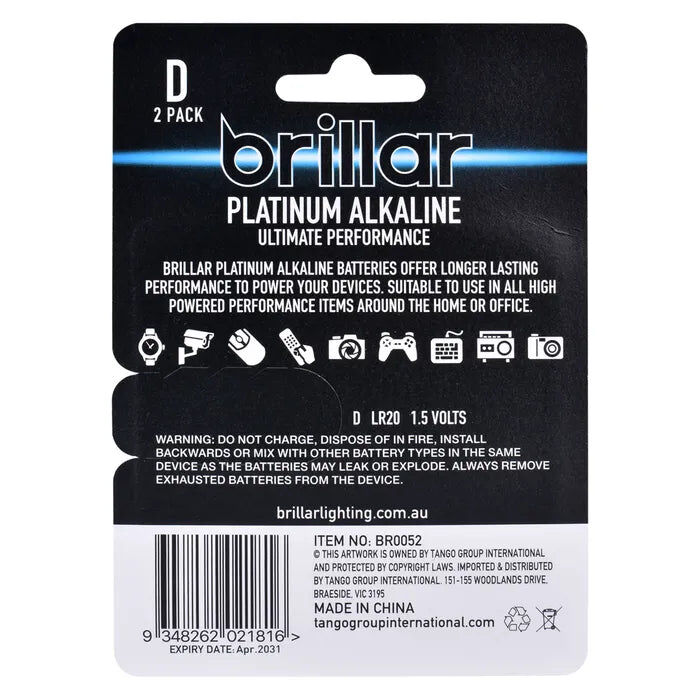 Brillar platinum alkaline batteries offer longer-lasting performance to power your devices. Suitable to use in all high powered performance items around the home or office.