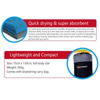 Lightweight, fast drying and compact, the Microfibre Travel Towel dries faster than a standard towel and is 1/8th the size of a standard towel, it comes with a drawstring carry bag.