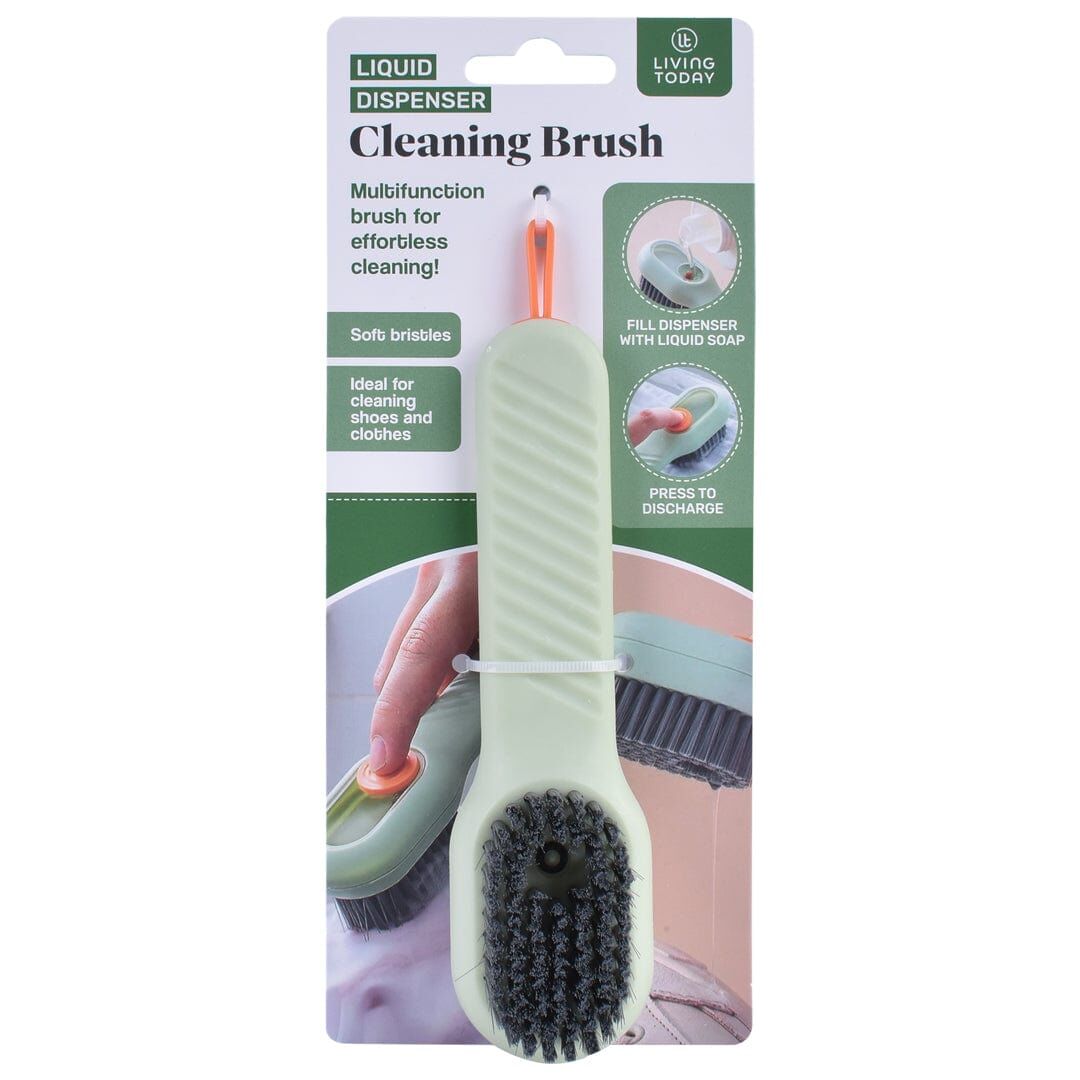Multifunctional cleaning brush with liquid soap dispenser features a one-click discharge.