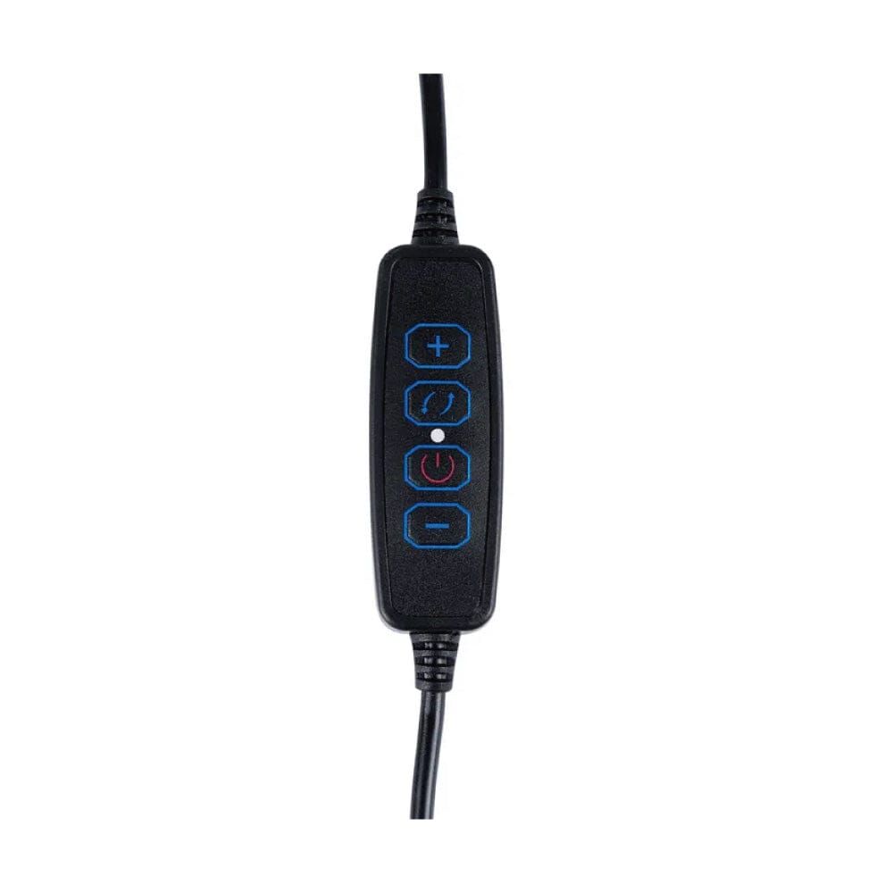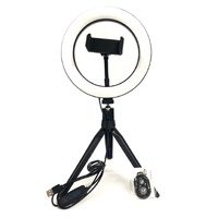 The LED Studio Ring Light with Stand and Phone Holder features a 20cm light ring with 360-degree rotation. This portable, battery-powered light can be used either vertically or horizontally and comes with a Bluetooth remote control for easy operation. The built-in tripod can be adjusted to suit your needs and has rubber feet for added stability. It's perfect for lighting up selfies and close-up photos at home or on the go.