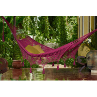 This gorgeous generous-sized hammock will quickly turn into your new favorite afternoon spot. Mayan Legacy artists hand-weave it from 100% cotton rope in elegant colours and add a beautiful crocheted fringe with tassels and floral designs for a glamorous finish. Just add a pair of straps or a frame and enjoy.