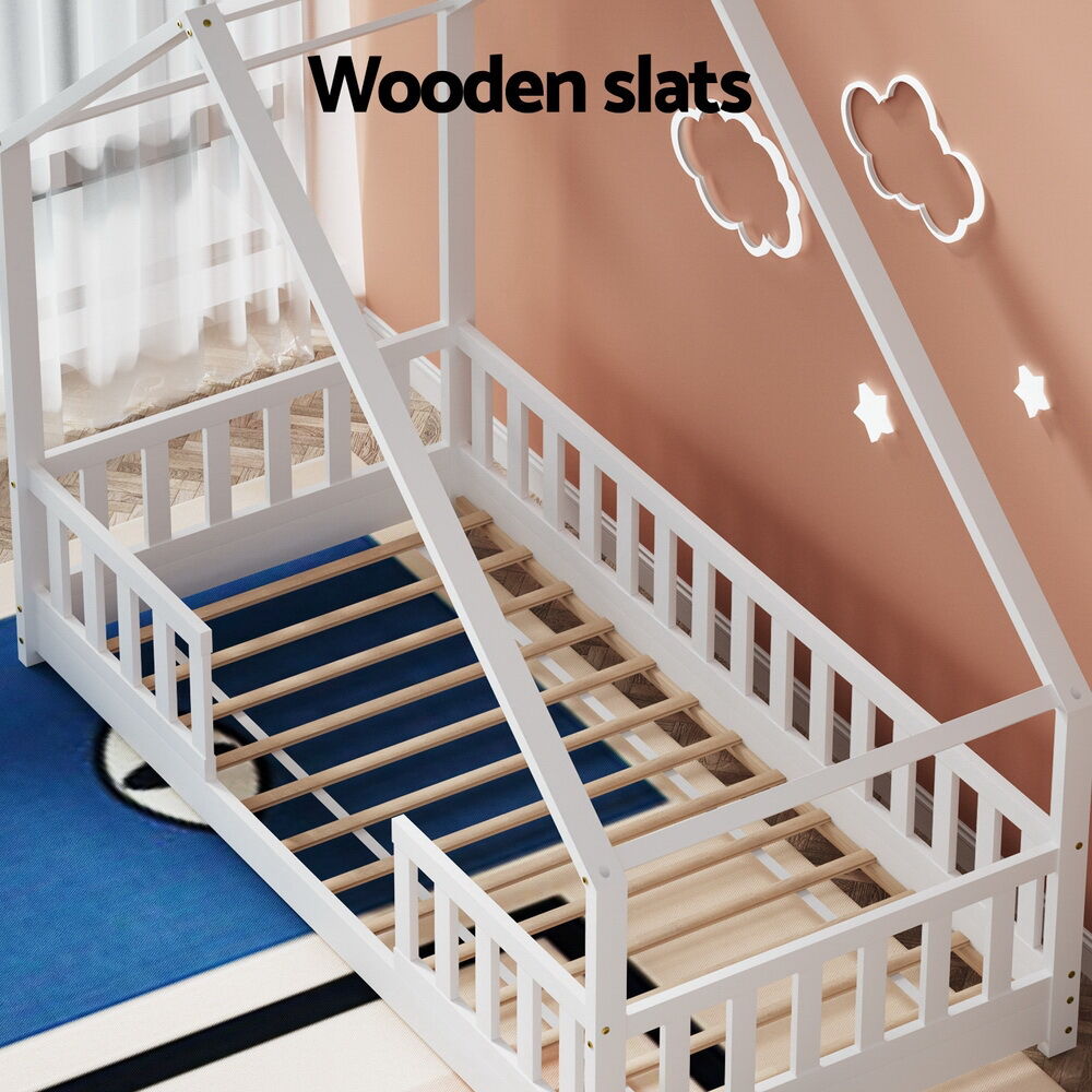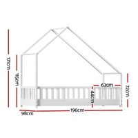 Introducing our whimsical house-shaped bed frame, crafted from solid pine wood for ultimate durability. Designed with kids in mind, it features safe, non-toxic paint, smooth edges, and sturdy construction. Easy to maintain and fitting a standard Australian Single mattress, it's the perfect addition to any child's bedroom.